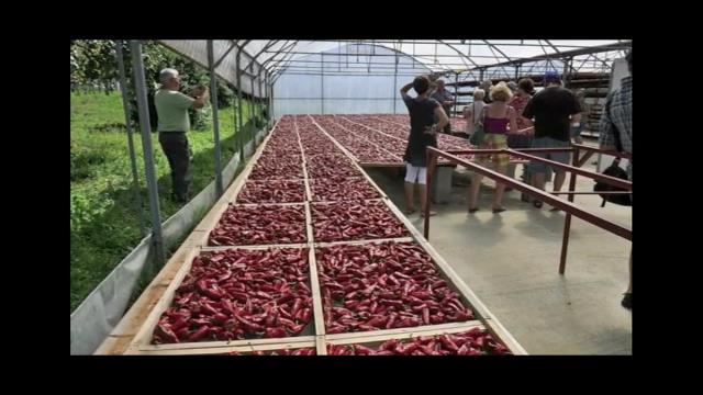 A Espelette Mr Lurrelik nous emmène dans le champ de piment. C'est le moment de la récolte. Nous visitons Ie hangar de séchage et la boutique. Profitons du site pour visiler la chocolaterie Anton où nous pouvons déguster du chocolat au piment.