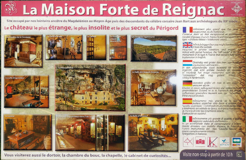 Classé monument historique, il est en Périgord le château le plus étrange, le plus secret, le plus extraordinaire et le plus mystérieux aussi. Construit sur un escarpement surplombant la vallée de la Vézère, Reignac a tout connu : depuis la Préhistoire il y a 20 000 ans où les chasseurs utilisaient ses vastes abris sous roche pour se protéger du froid jusqu’au Moyen âge et l’édification du Château Falaise. Infiniment plus grand que l’on peut le soupçonner vu de l’extérieur, la façade cache d’impressionnantes salles souterraines et aériennes, grande salle d’honneur, salle d’armes, salle à manger, salon, cuisine, chambres, chapelle, cachot, cul de basse-fosse (oubliettes), cave.