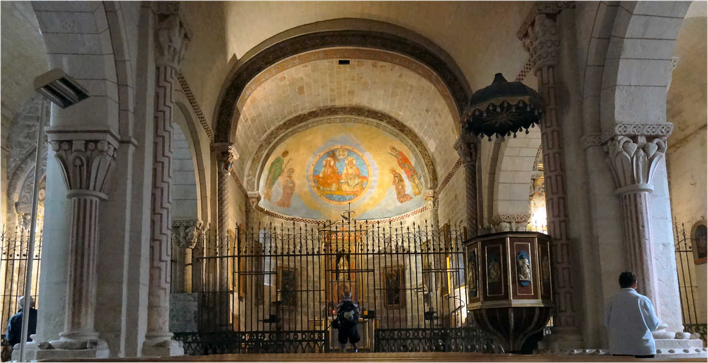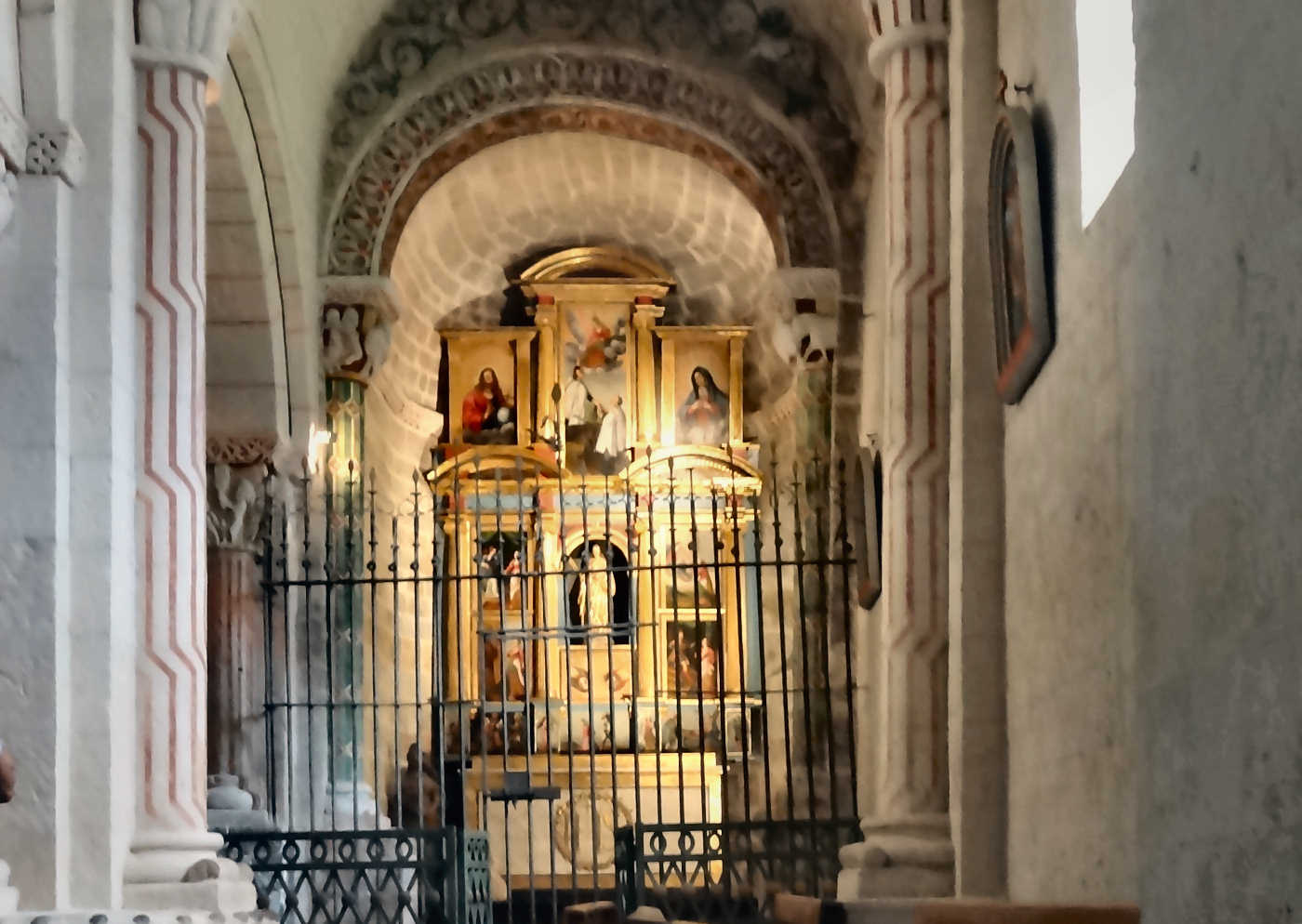 L'église est romane, massive, avec une abside, deux absidioles et un clocher carré. Les trois nefs comptent 12 chapiteaux remarquables.