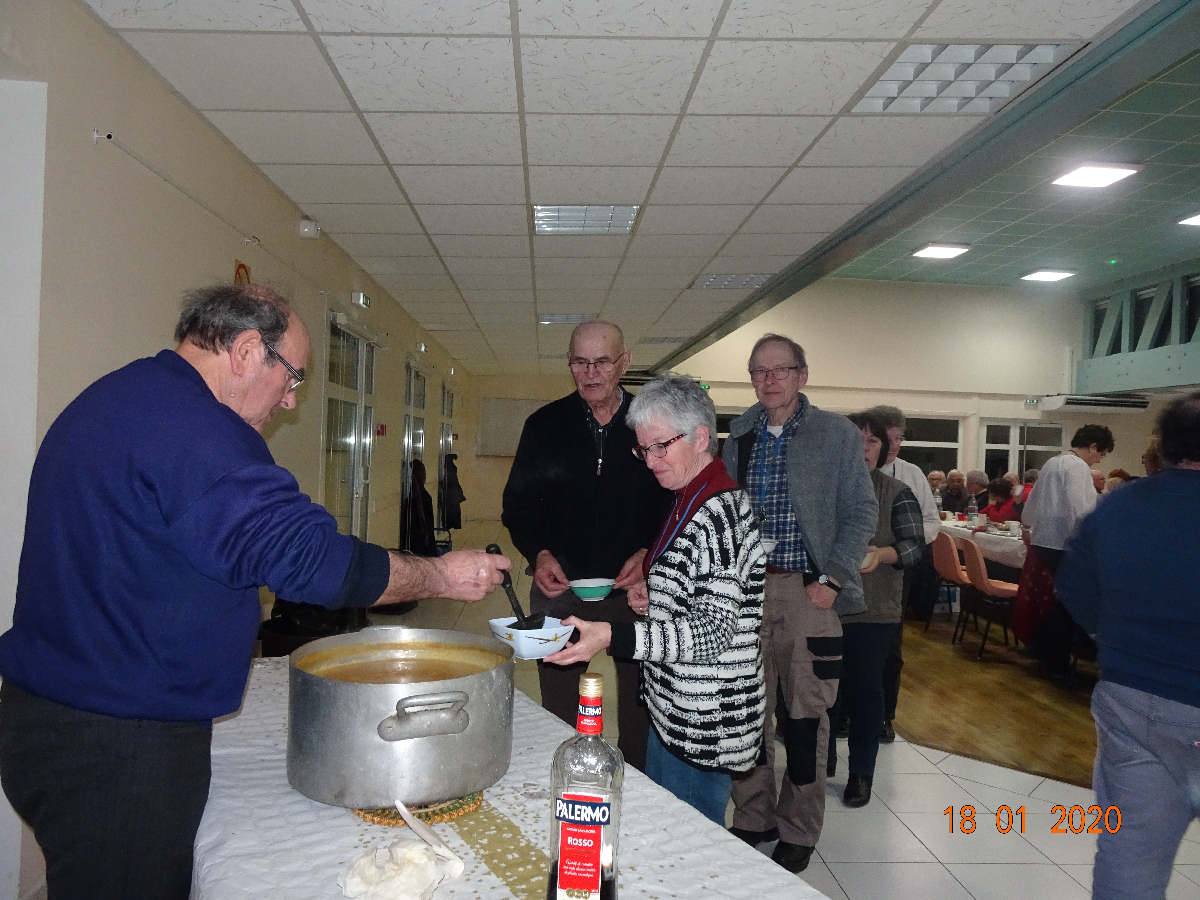 L’après-midi nous avons fait un concours de belote qui a réuni 40 participants qui ont eu droit chacun à un lot; pendant ce temps Ginette a animé quelques jeux en société, pendant que Francis préparait un vin chaud que tout le monde a apprécié à l’entracte ! Le soir nous avons eu droit è une bonne soupe campagnarde préparée par toute l’équipe organisatrice. La soirée fut animée par nos 2 accordéonistes : les GERARD ! Il y eut également un jeu de mots, Michelle et Basile et en chanson nous finîmes par la chanson de "L'Amitié" de Camille et Monette.